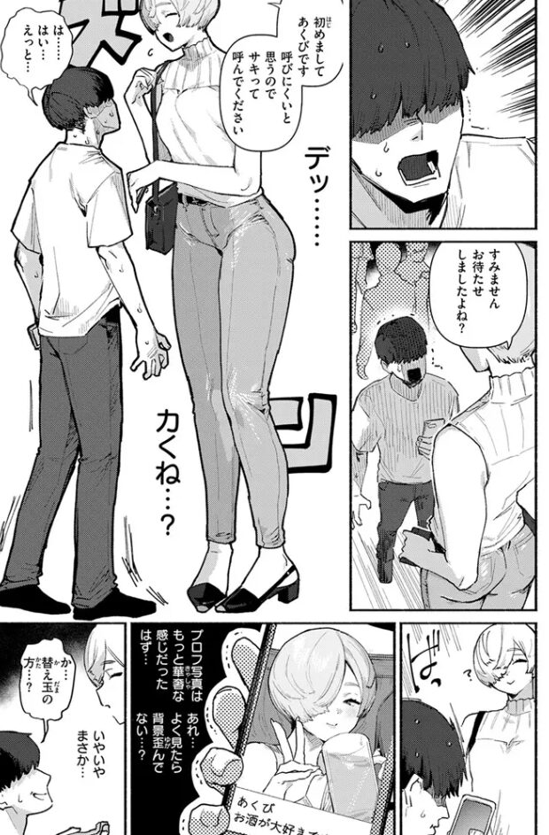 マッチングアプリの女性が予想以上に背が高くて怖い!と思いつつも心を許した途端にホテルでがっつり襲われちゃうエロ漫画です♪